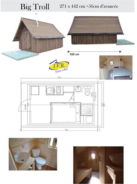 Equipement électrique: LED sur toute la longueur du faîte -Lampe extérieur -Tableau électrique+2 prises +2 interrupteurs -Fourni avec un radiateur électrique de 1000Watts. -petite lampe de chevet à côté du lit de l’alcôve -Plaque céramique -réfrigérateur
